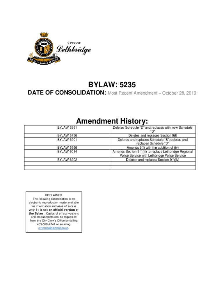 BYLAW: 5235 DATE OF CONSOLIDATION: Most Recent Amendment October 28, 2019Amendment History: BYLAW 5361 BYLAW 5756 BYLAW 5901 BYLAW 5956 BYLAW 6014 BYLAW 6202DISCLAIMER: The following consolidation