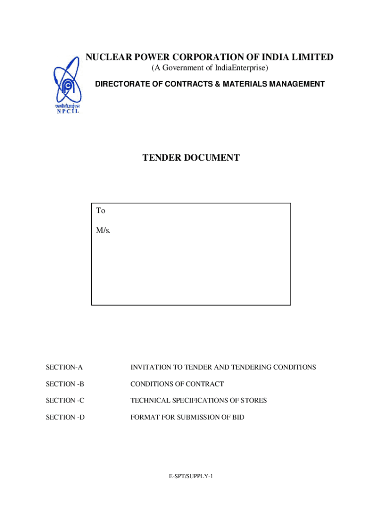 NUCLEAR POWER CORPORATION OF INDIA LIMITED (A Government of India Enterprise)DIRECTORATE OF CONTRACTS & MATERIALS MANAGEMENTTENDER Document M/s.SECTIONAINVITATION TO TENDER AND TENDERING CONDITIONSSECTION