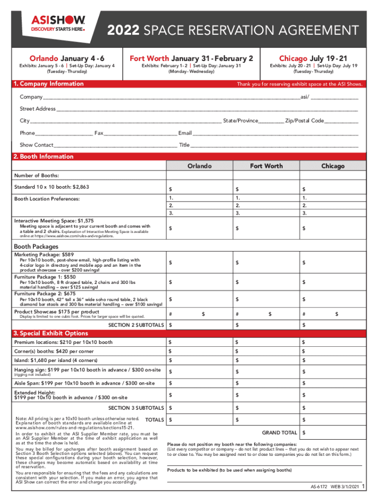 2022 SPACE RESERVATION AGREEMENT Orlando January 4 6Exhibits: January 5 6 | SetUp Day: January 4 (Tuesday Thursday)Fort Worth January 31 February 2 Exhibits: February 1 2 | SetUp Day: January 31 (Monday