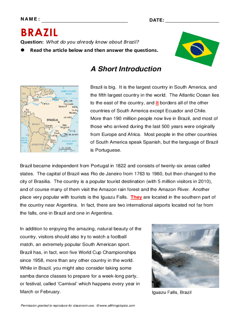 N A M E : ___DATE: ___BRAZIL Question: What do you already know about Brazil? Read the article below and then answer the questions. A Short Introduction Brazil is big. It is the largest country in