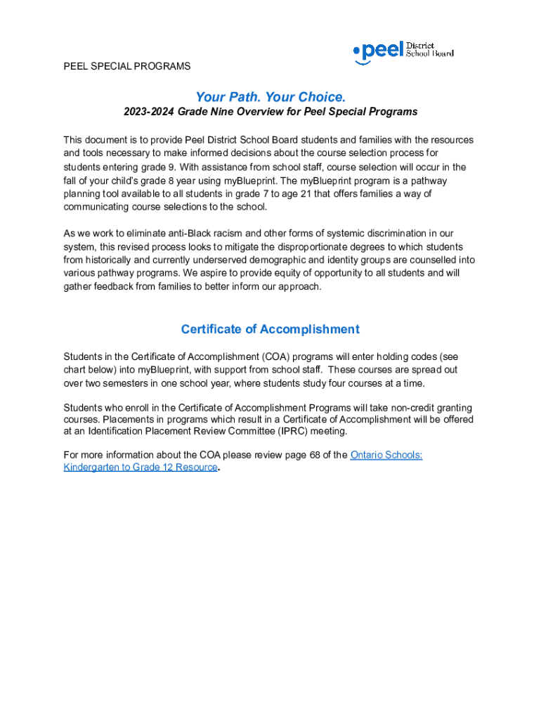 PEEL SPECIAL PROGRAMSYour Path. Your Choice. 20232024 Grade Nine Overview for Peel Special Programs This document is to provide Peel District School Board students and families with the resources