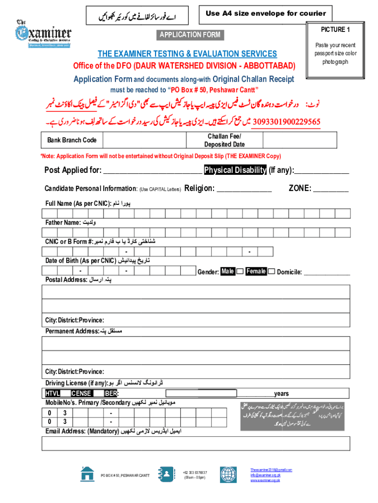 Use A4 size envelope for courier PICTURE 1APPLICATION FORTH EXAMINER TESTING & EVALUATION SERVICES Office of the DFO (DOUR WATERSHED DIVISION ABBOTTABAD) ABBOTTABAD Application Form and documents