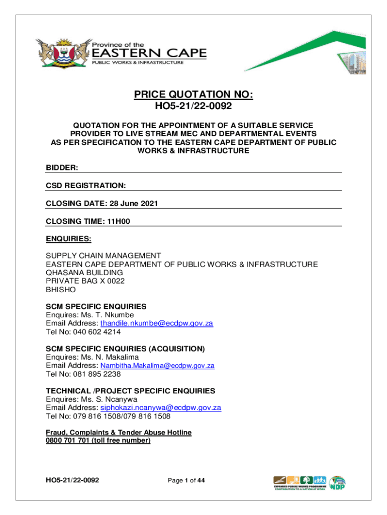 PRICE QUOTATION NO: HO521/220092 QUOTATION FOR THE APPOINTMENT OF A SUITABLE SERVICE PROVIDER TO LIVE STREAM MEC AND DEPARTMENTAL EVENTS AS PER SPECIFICATION TO THE EASTERN CAPE DEPARTMENT OF PUBLIC