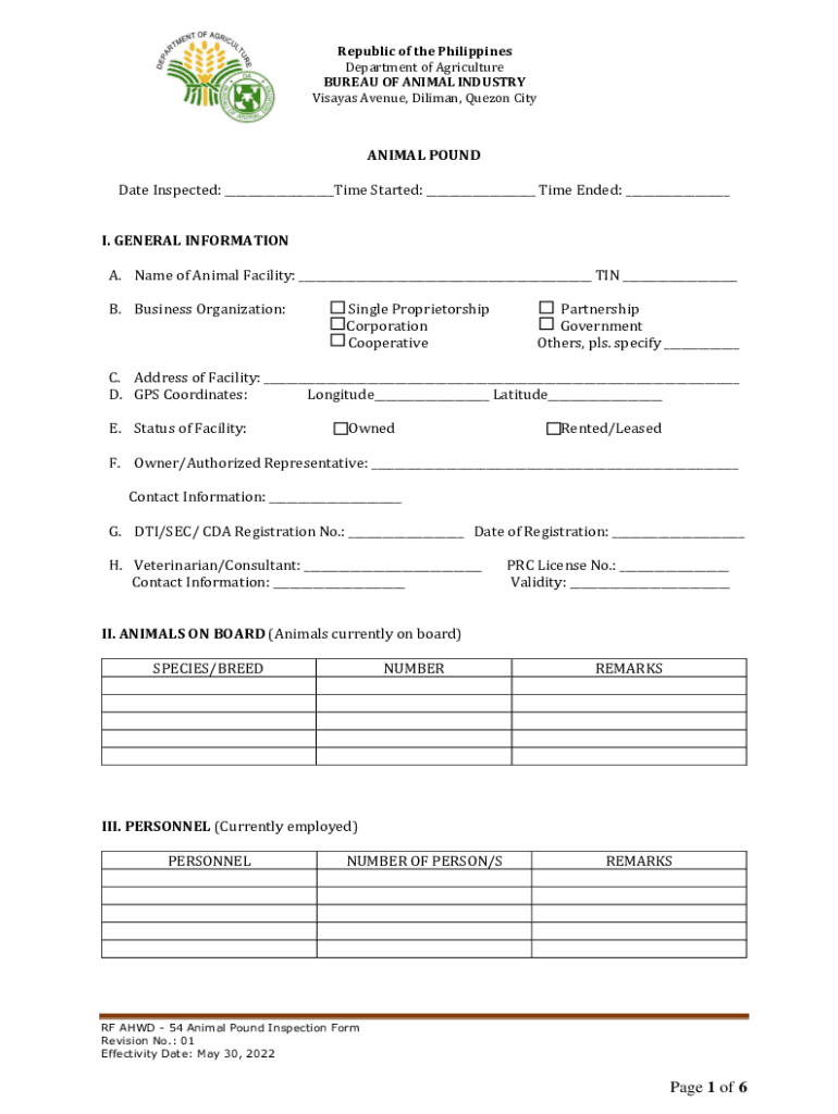 Republic of the Philippines Department of Agriculture BUREAU OF ANIMAL INDUSTRY Visayans Avenue, Dalian, Quezon CityANIMAL POUND Date Inspected: ___Time Started: ___ Time Ended: ___ I. GENERAL INFORMATION
