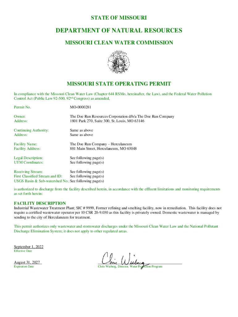Get the free Draft Missouri State Operating Permit MO0043362, Sept. 23 ...