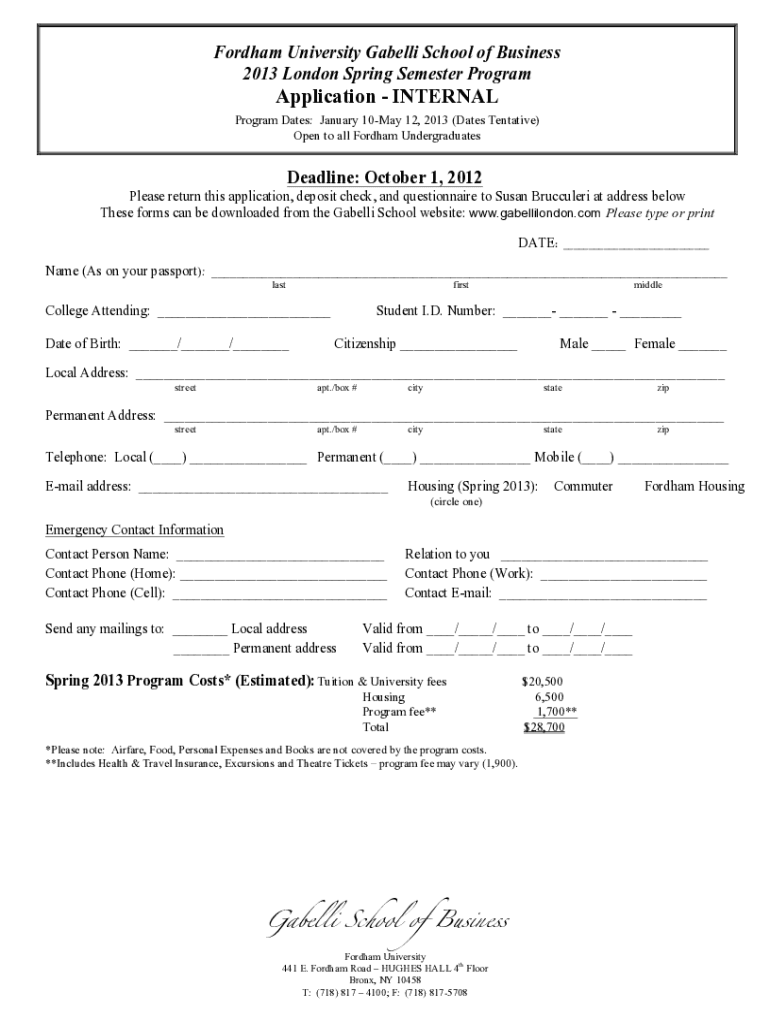 Fordham University Gazelle School of Business 2013 London Spring Semester ProgramApplication INTERNAL Program Dates: January 10May 12, 2013 (Dates Tentative) Open to all Fordham UndergraduatesDeadline: