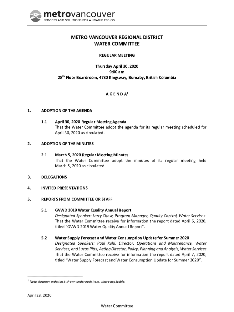 METROVANCOUVERREGIONALDISTRICT WATERCOMMITTEE REGULARMEETING ThursdayApril30,2020 9:00am TH 28 Floorboard room,4730Kingsway,Burnaby, British Columbia AGENDA1 1. ADOPTIONOFTHEAGENDA 1.1 2. 3. 4. 5.