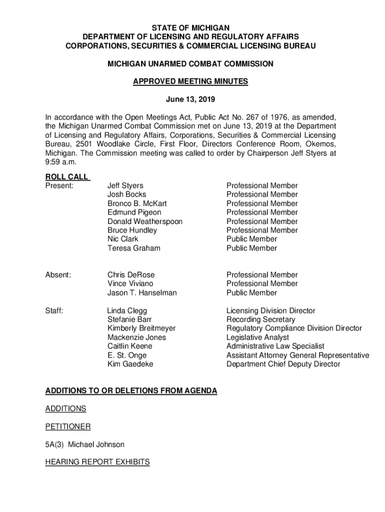 STATE OF MICHIGAN DEPARTMENT OF LICENSING AND REGULATORY AFFAIRS CORPORATIONS, SECURITIES & COMMERCIAL LICENSING BUREAU MICHIGAN UNARMED COMBAT COMMISSION APPROVED MEETING MINUTES June 13, 2019, In