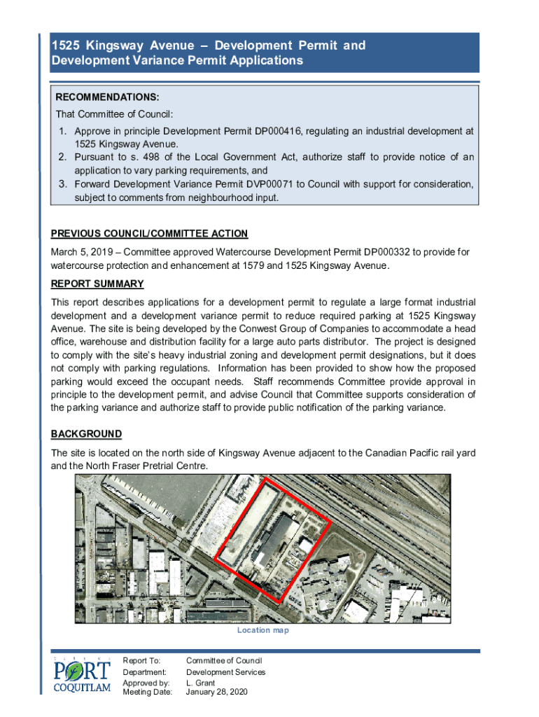 1525 King sway Avenue Development Permit and Development Variance Permit Applications RECOMMENDATIONS: That Committee of Council: 1. Approve in principle Development Permit DP000416, regulating an