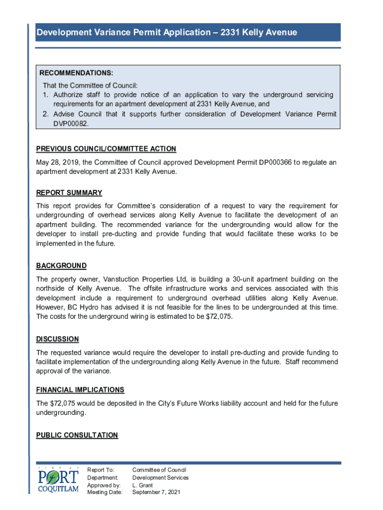 Development Variance Permit Application 2331 Kelly AvenueRECOMMENDATIONS: That the Committee of Council: 1. Authorize staff to provide notice of an application to vary the underground servicing requirements