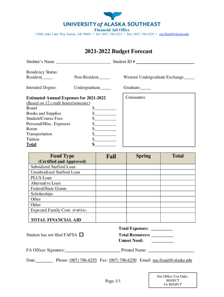 Financial Aid Office 11066 Duke Lake Way Juneau, AK 99801 Tel: (907) 7966255 Fax: (907) 7966250 UAS.finaid@alaska.edu20212022 Budget Forecast Students Name ___ Student ID # Residency Status: Resident___NonResident___Western