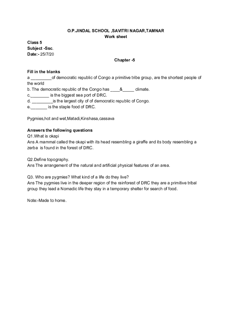 O.P.FINAL SCHOOL, SAVITṚ NAGAR, TAMAR Work sheet Class 5 Subject SSC. Date: 25/7/20 Chapter 5 Fill in the blanks a ___of democratic republic of Congo a primitive tribe group, are the shortest people