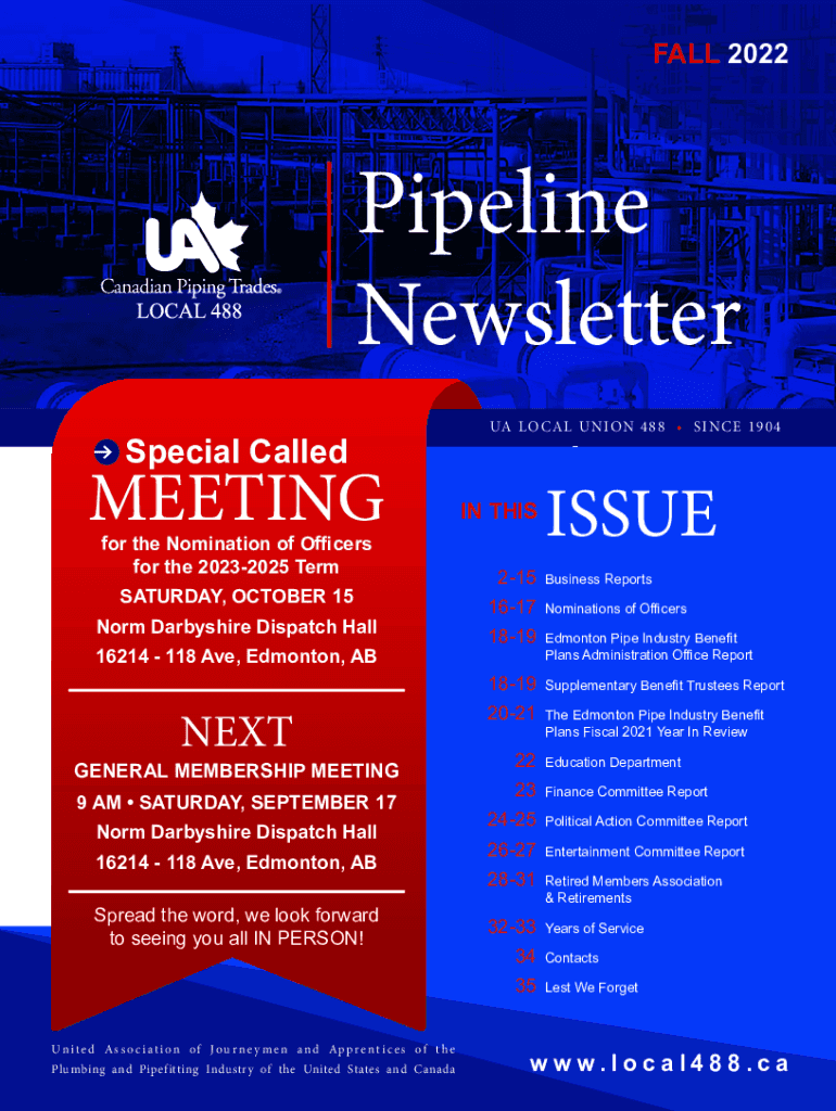 FALL 2022Pipeline Newsletter UA LO C A L U N ION 4 8 8 SI NCE 1 9 0 4Special CalledMEETING for the Nomination of Officers for the 20232025 Term SATURDAY, OCTOBER 15 Norm Darby shire Dispatch Hall