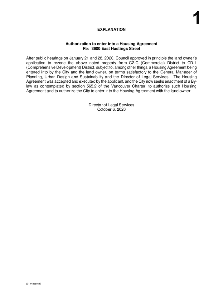 EXPLANATION1Authorization to enter into a Housing Agreement Re: 3600 East Hastings Street After public hearings on January 21 and 28, 2020, Council approved in principle the landowners' application