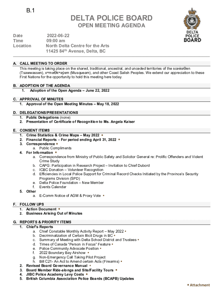 B.1DELTA POLICE BOARD1OPEN MEETING AGENDADate Time Location20220622 09:00 am North Delta Center for the Arts 11425 84th Avenue, Delta, BCA. CALL MEETING TO ORDER This meeting is taking place on the
