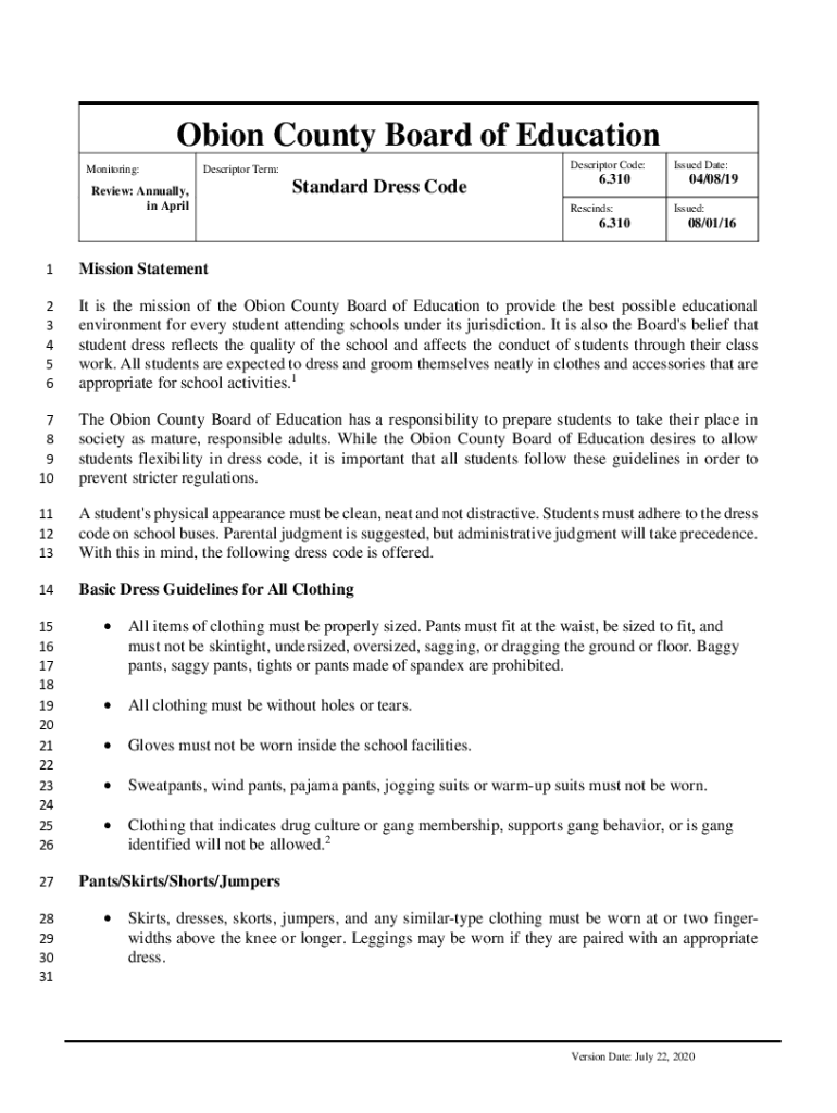 Get the free Standard Dress Code - Obion County Schools