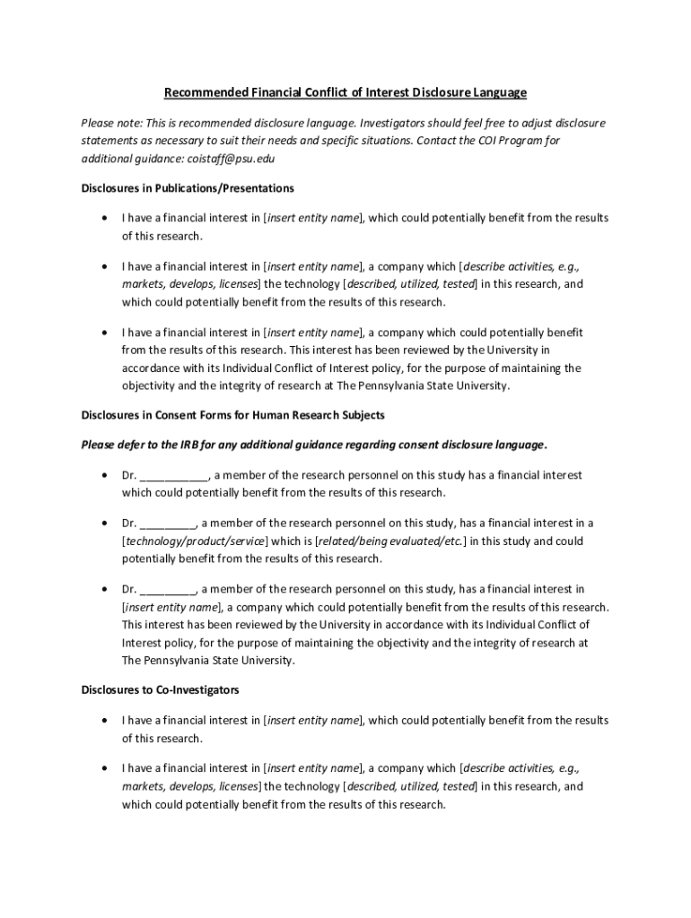 Recommended Financial Conflict of Interest Disclosure Language Please note: This is recommended disclosure language. Investigators should feel free to adjust disclosure statements as necessary to