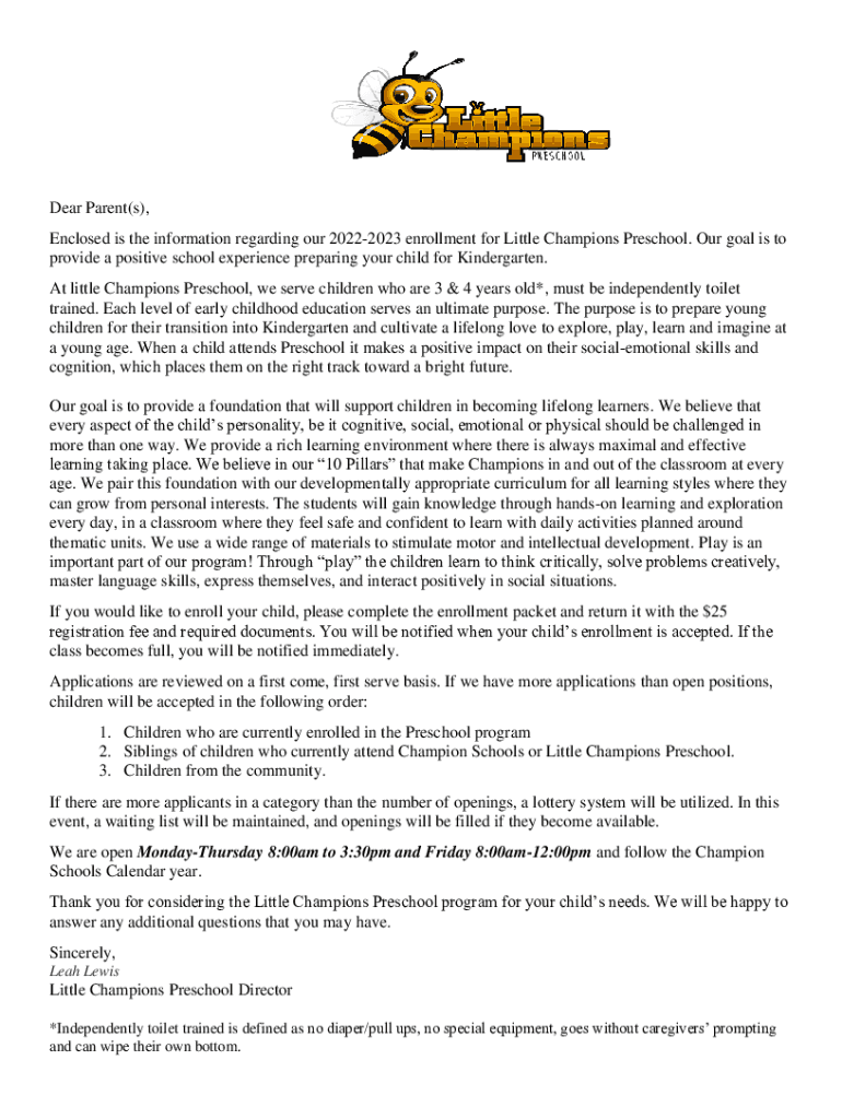 Dear Parent(s), Enclosed is the information regarding our 20222023 enrollment for Little Champions Preschool. Our goal is to provide a positive school experience preparing your child for Kindergarten.