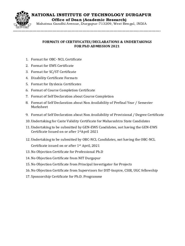 NATIONAL INSTITUTE OF TECHNOLOGY DURGAPUR Office of Dean (Academic Research) Mahatma Gandhi Avenue, Durgapur713209, West Bengal, INDIAFORMATS OF CERTIFICATES/DECLARATIONS & UNDERTAKINGS FOR PhD ADMISSION