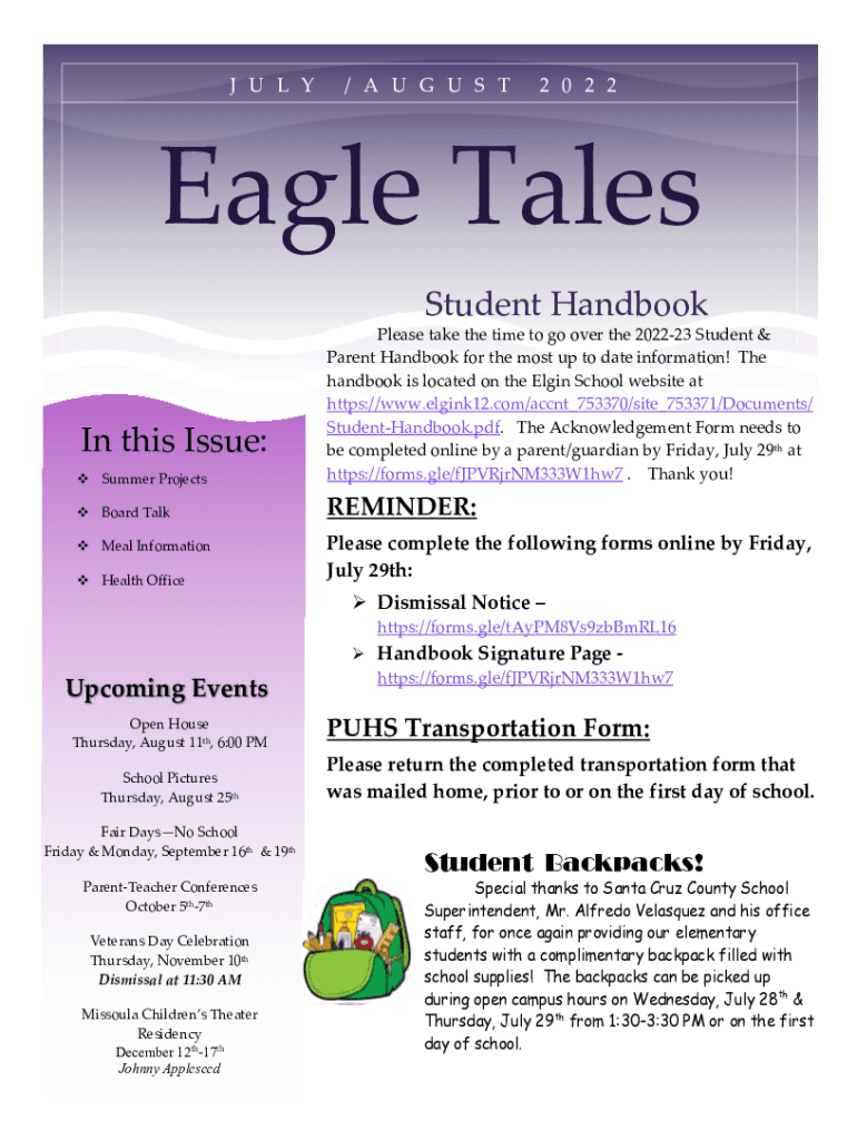 J U L Y/ A U G U S T2 0 2 2Eagle Tales Student Handbook Summer ProjectsPlease take the time to go over the 202223 Student & Parent Handbook for the most up to date information! The handbook is located