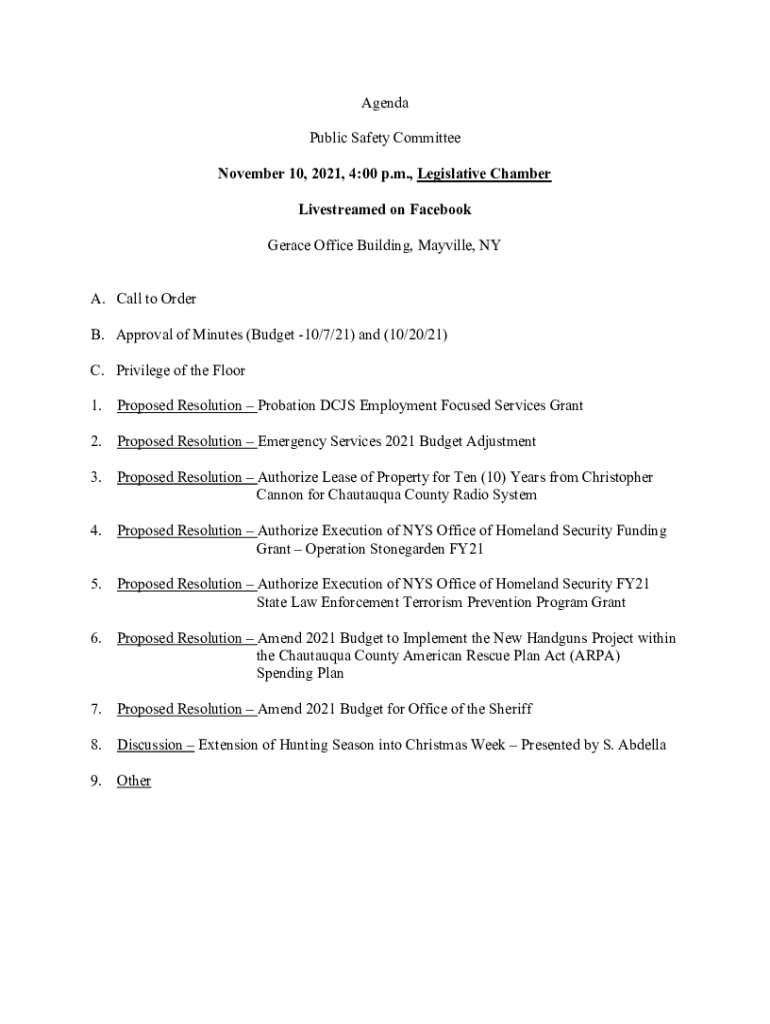 Agenda Public Safety Committee November 10, 2021, 4:00 p.m., Legislative Chamber Livestreamed on Facebook Grace Office Building, Maryville, NY A. Call to Order B. Approval of Minutes (Budget 10/7/21)