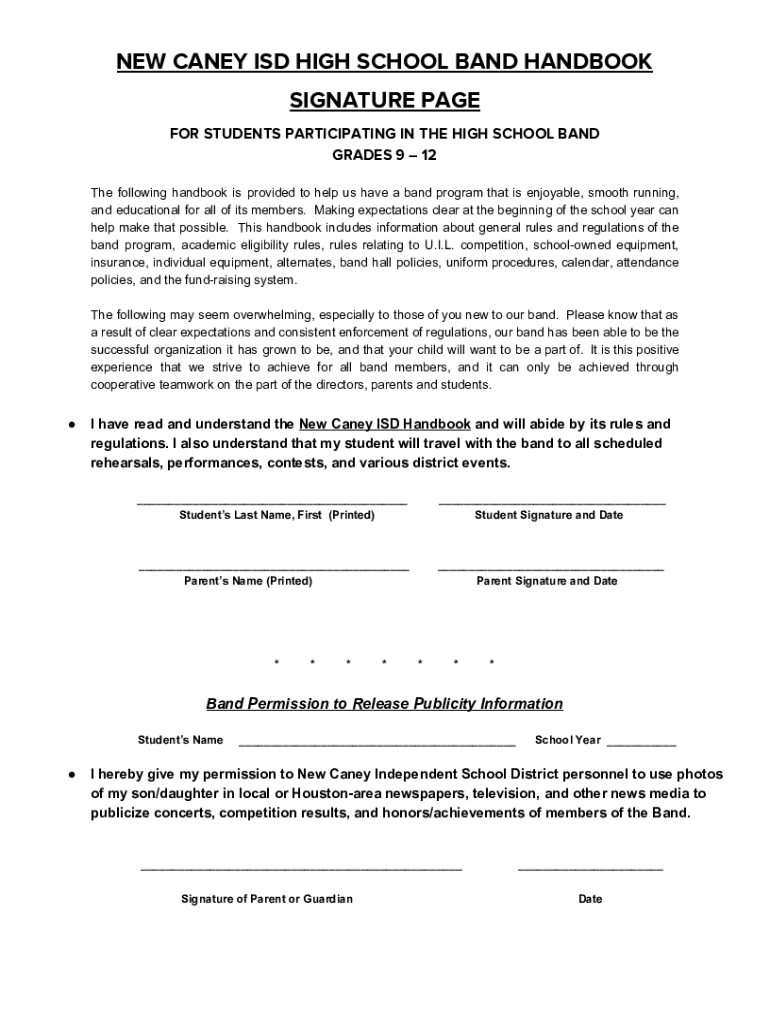 NEW CAREY ISD HIGH SCHOOL BAND HANDBOOK SIGNATURE PAGE FOR STUDENTS PARTICIPATING IN THE HIGH SCHOOL BAND GRADES 9 12 The following handbook is provided to help us have a band program that is enjoyable,