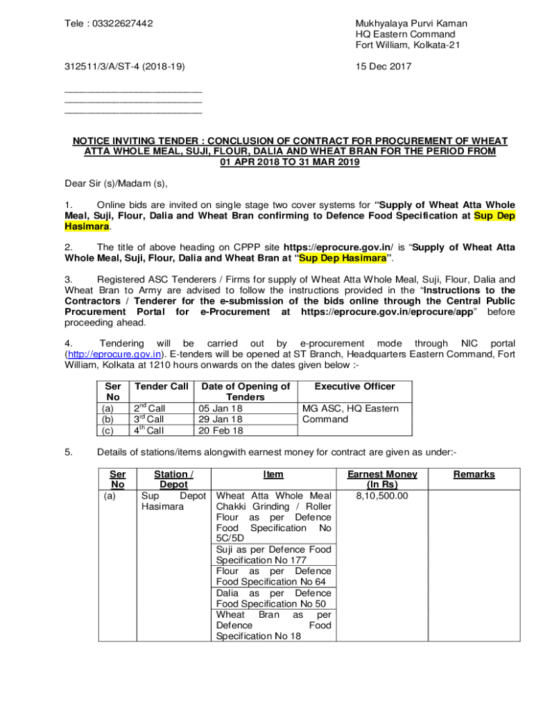 Tell : 03322627442Mukhyalaya Curve Kazan HQ Eastern Command Fort William, Kolkata21312511/3/A/ST4 (201819)15 Dec 2017___ ___ ___ NOTICE INVITING TENDER : CONCLUSION OF CONTRACT FOR PROCUREMENT OF