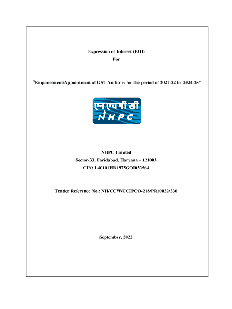 Expression of Interest (EOI) ForEmpanelment/Appointment of GST Auditors for the period of 202122 to 202425NHPC Limited Sector33, Faridabad, Haryana 121003 IN: L40101HR1975GOI032564Tender Reference