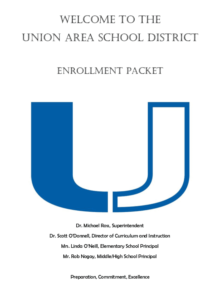 WELCOME TO THE UNION AREA SCHOOL DISTRICT ENROLLMENT PACKET Dr. Michael Ross, Superintendent Dr. Scott O'Donnell, Director of Curriculum and Instruction Mrs. Linda O'Neill, Elementary School Principal