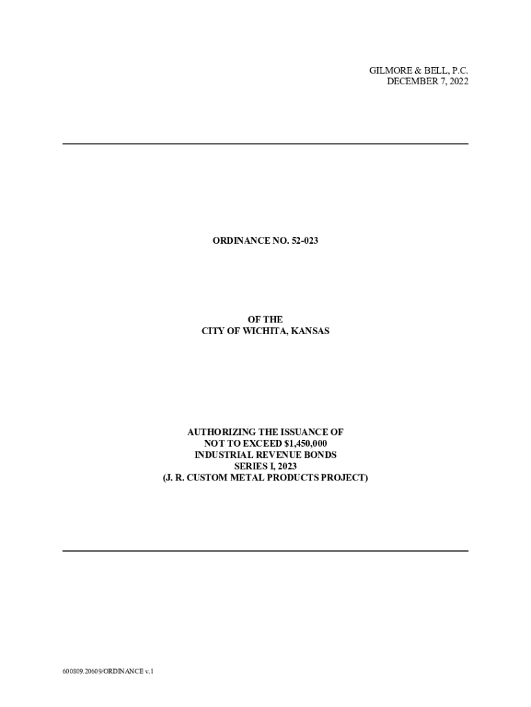 GILMORE & BELL, P.C. DECEMBER 7, 2022ORDINANCE NO. 52023OF THE CITY OF WICHITA, KANSASAUTHORIZING THE ISSUANCE OF NOT TO EXCEED $1,450,000 INDUSTRIAL REVENUE BONDS SERIES I, 2023 (J. R. CUSTOM METAL