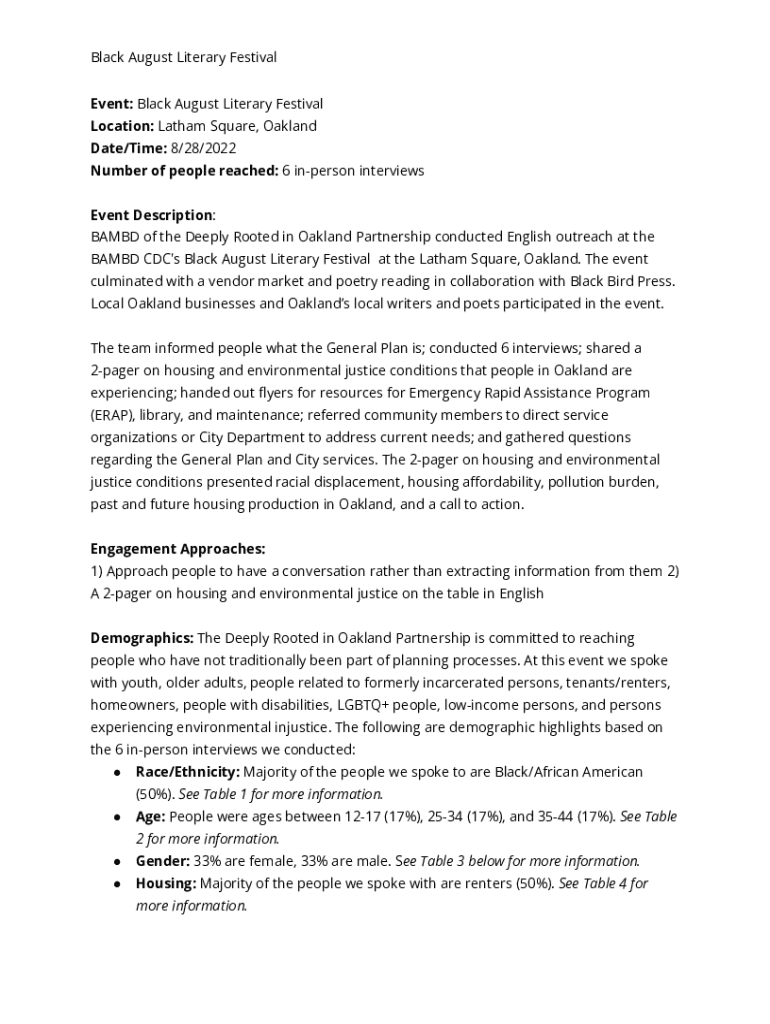 Black August Literary Festival Event: Black August Literary Festival Location: Latham Square, Oakland Date/Time: 8/28/2022 Number of people reached: 6 unperson interviews Event Description: BAMBI