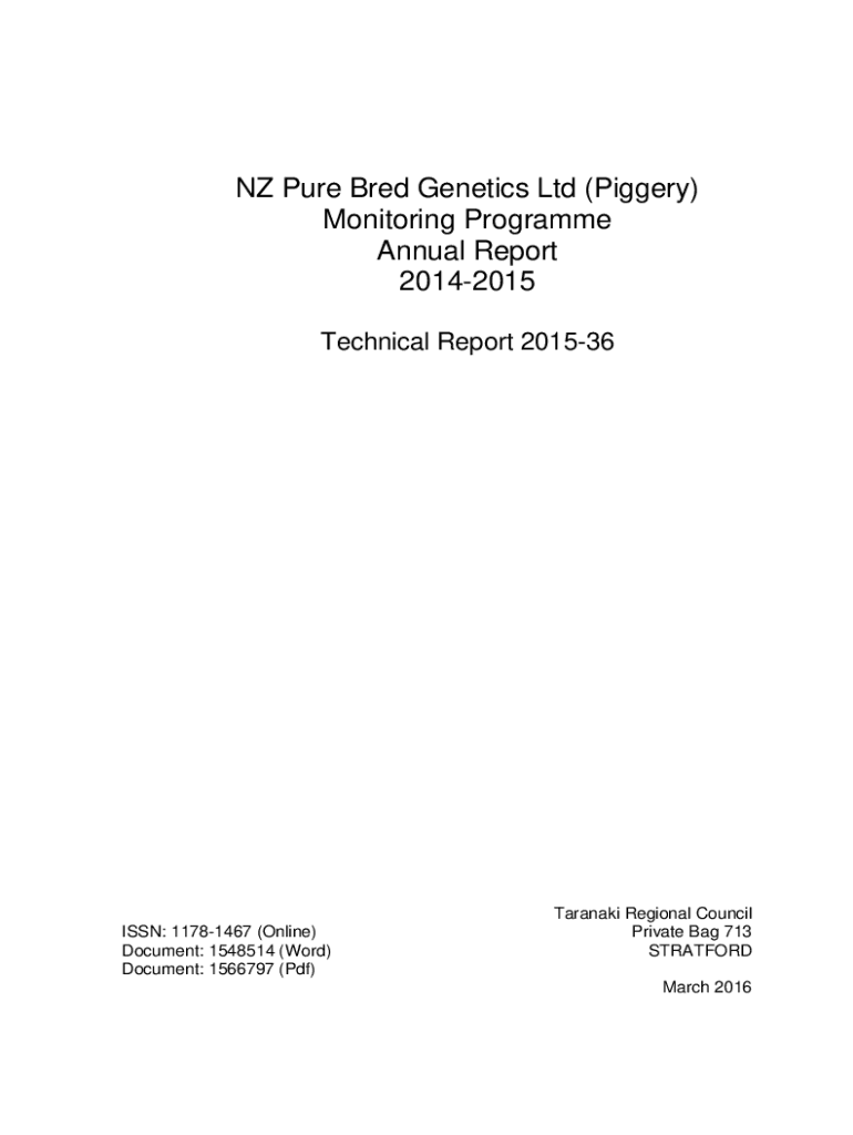 NZ Pure Bred Genetics Ltd (Piggery) Monitoring Program Annual Report 20142015 Technical Report 201536ISSN: 11781467 (Online) Document: 1548514 (Word) Document: 1566797 (PDF)Varanasi Regional Council