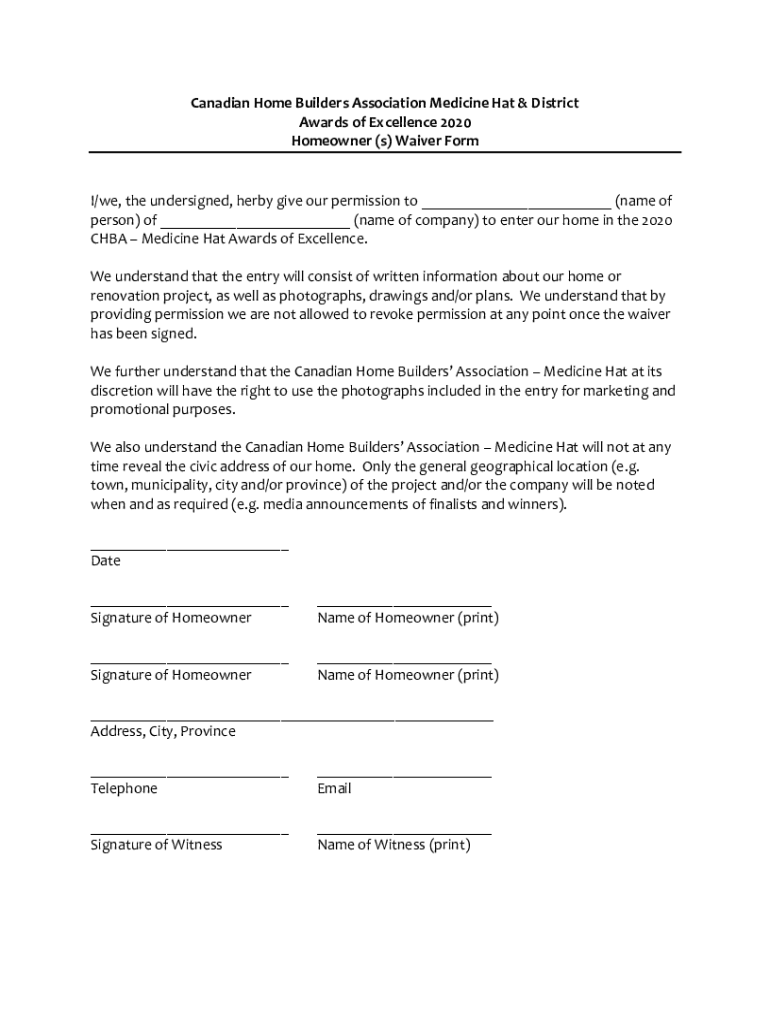 Canadian Home Builders Association Medicine Hat & District Awards of Excellence 2020 Homeowner (s) Waiver Form/we, the undersigned, Derby give our permission to ___ (name of person) of ___ (name of