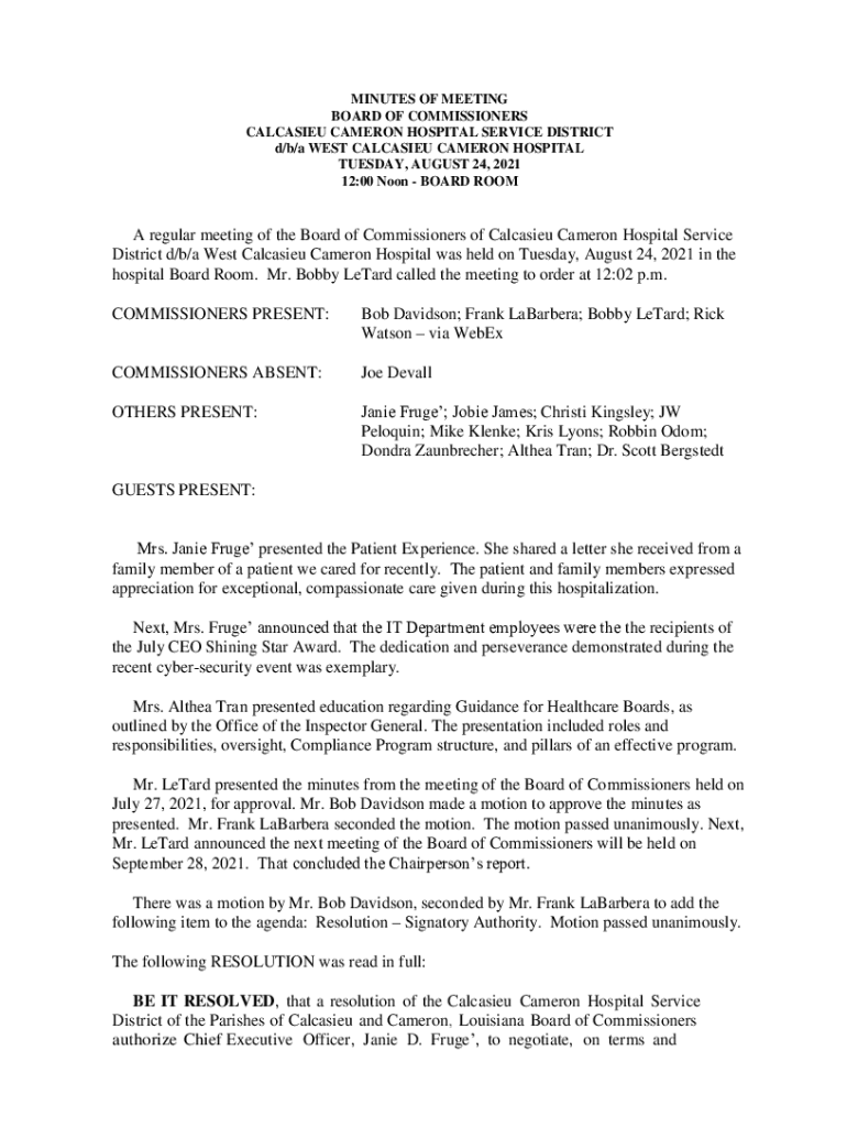 MINUTES OF MEETING BOARD OF COMMISSIONERS CALCASIEU CAMERON HOSPITAL SERVICE DISTRICT d/b/a WEST CALCASIEU CAMERON HOSPITAL TUESDAY, AUGUST 24, 2021 12:00 Noon Boardroom regular meeting of the Board