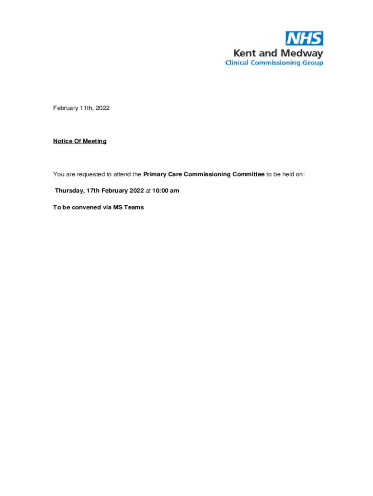 February 11th, 2022Notice Of Meeting are requested to attend the Primary Care Commissioning Committee to be held on: Thursday, 17th February 2022 at 10:00 am To be convened via MS TeamsAgenda For