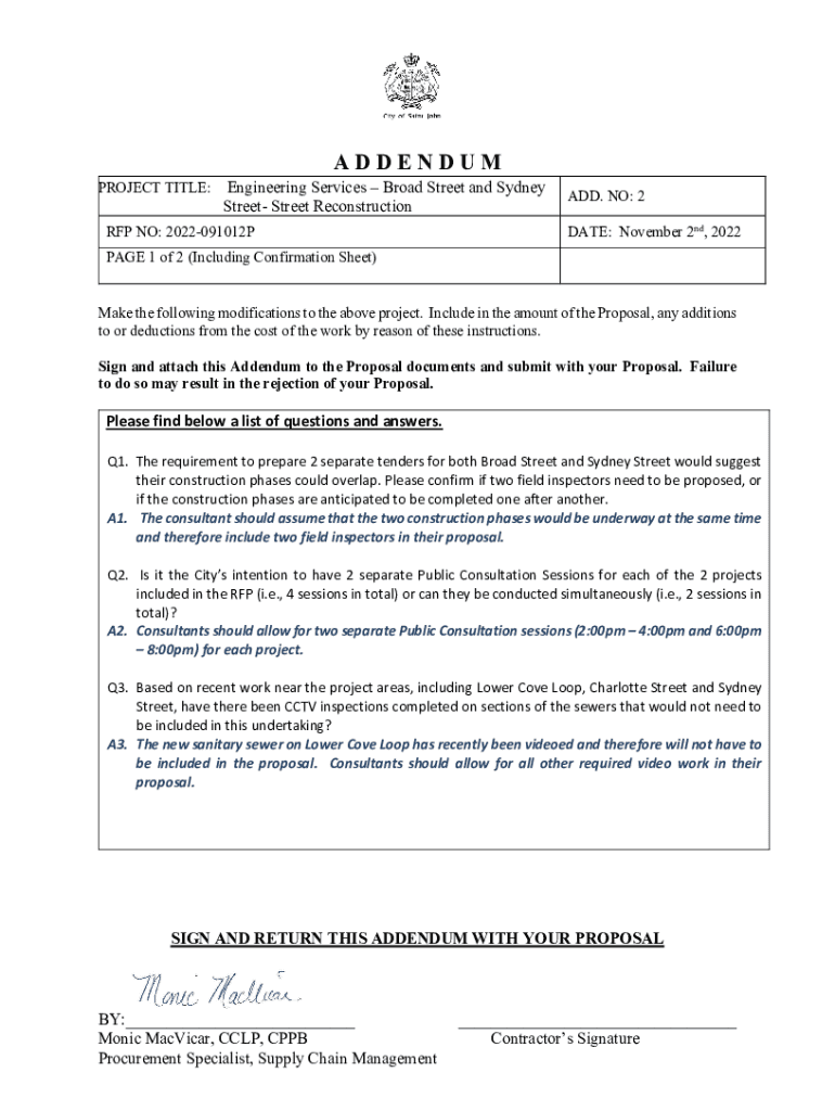 PROJECT TITLE:ADDENDUMEngineering Services Broad Street and Sydney Street Reconstruction RFP NO: 2022091012PADD. NO: 2 DATE: November 2nd, 2022PAGE 1 of 2 (Including Confirmation Sheet) Make the following