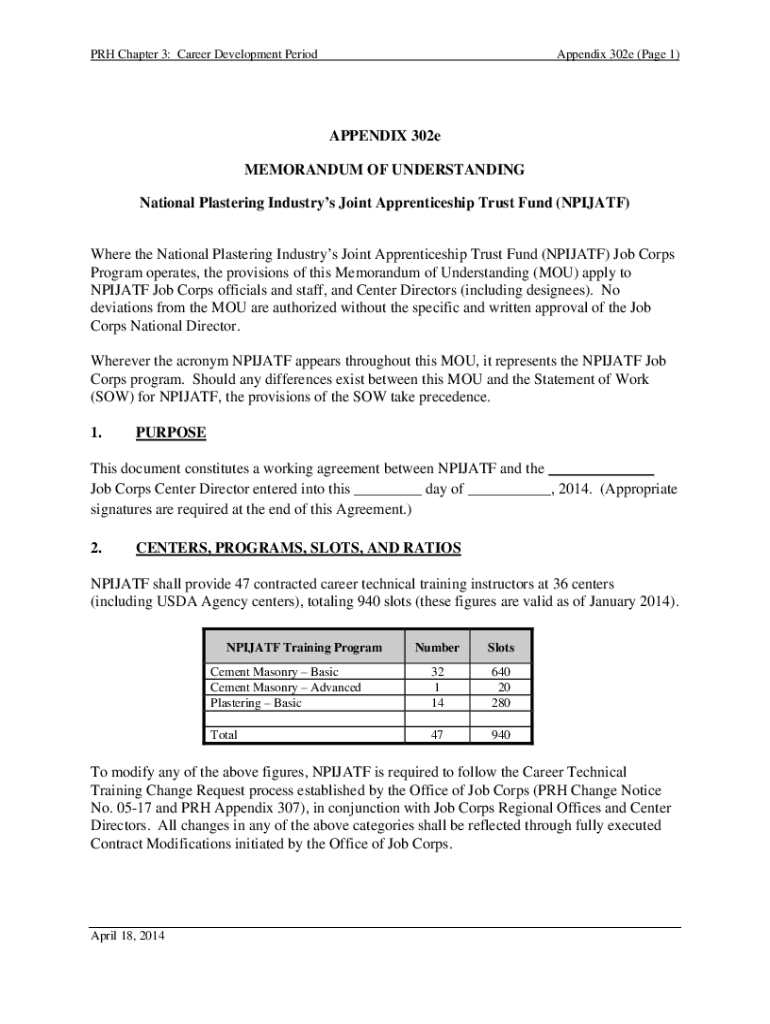 PRO Chapter 3: Career Development PeriodAppendix 302e (Page 1) APPENDIX 302e MEMORANDUM OF UNDERSTANDING National Plastering Industries Joint Apprenticeship Trust Fund (PIRATE) Where the National