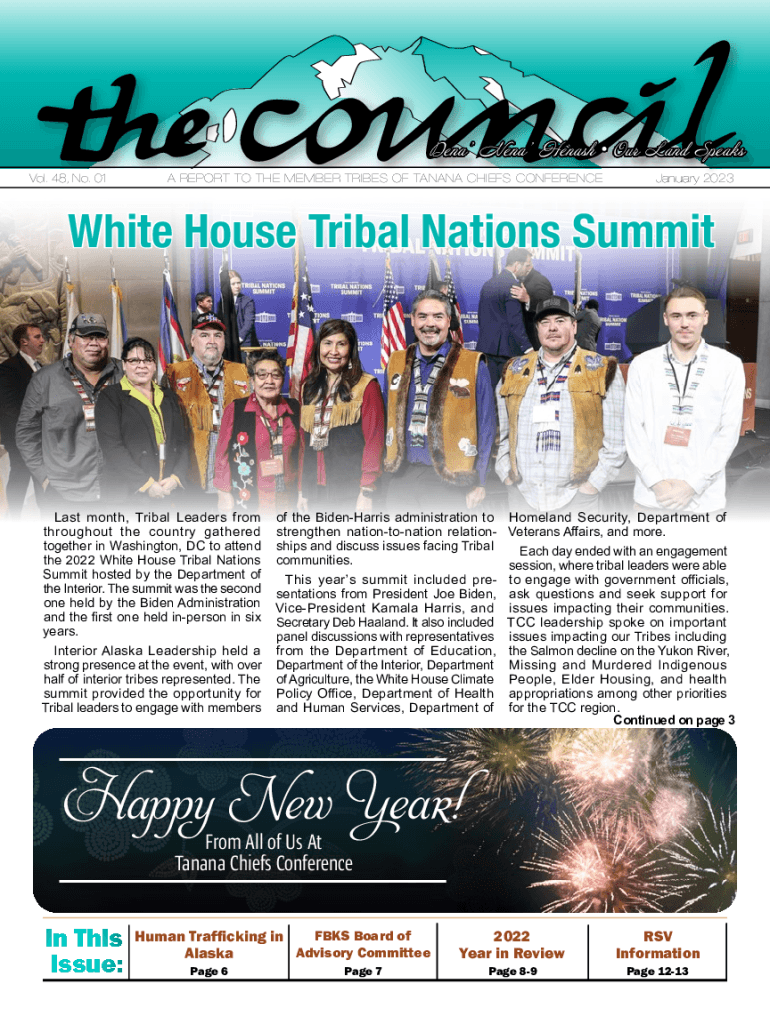 Dena Nina Hen ash Our Land Speaks Vol. 48, No. 01A REPORT TO THE MEMBER TRIBES OF BANANA CHIEFS CONFERENCE January 2023White House Tribal Nations Summits month, Tribal Leaders from throughout the