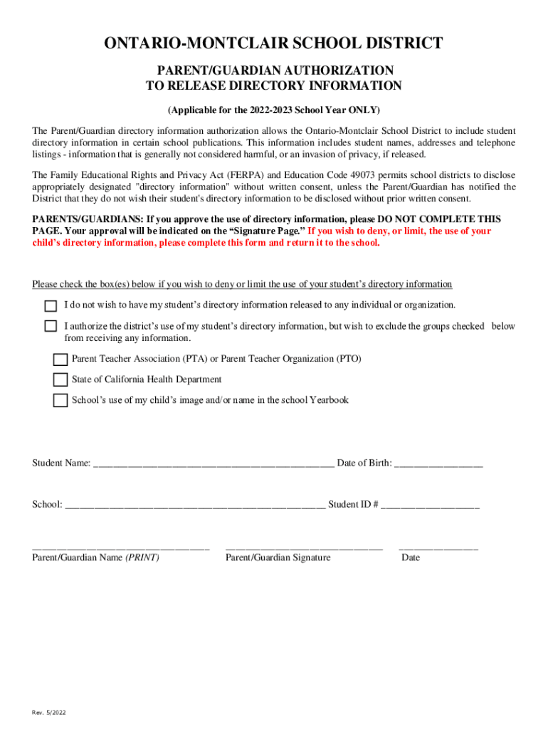 ONTARIOMONTCLAIR SCHOOL DISTRICT PARENT/GUARDIAN AUTHORIZATION TO RELEASE DIRECTORY INFORMATION (Applicable for the 20222023 School Year ONLY) The Parent/Guardian directory information authorization