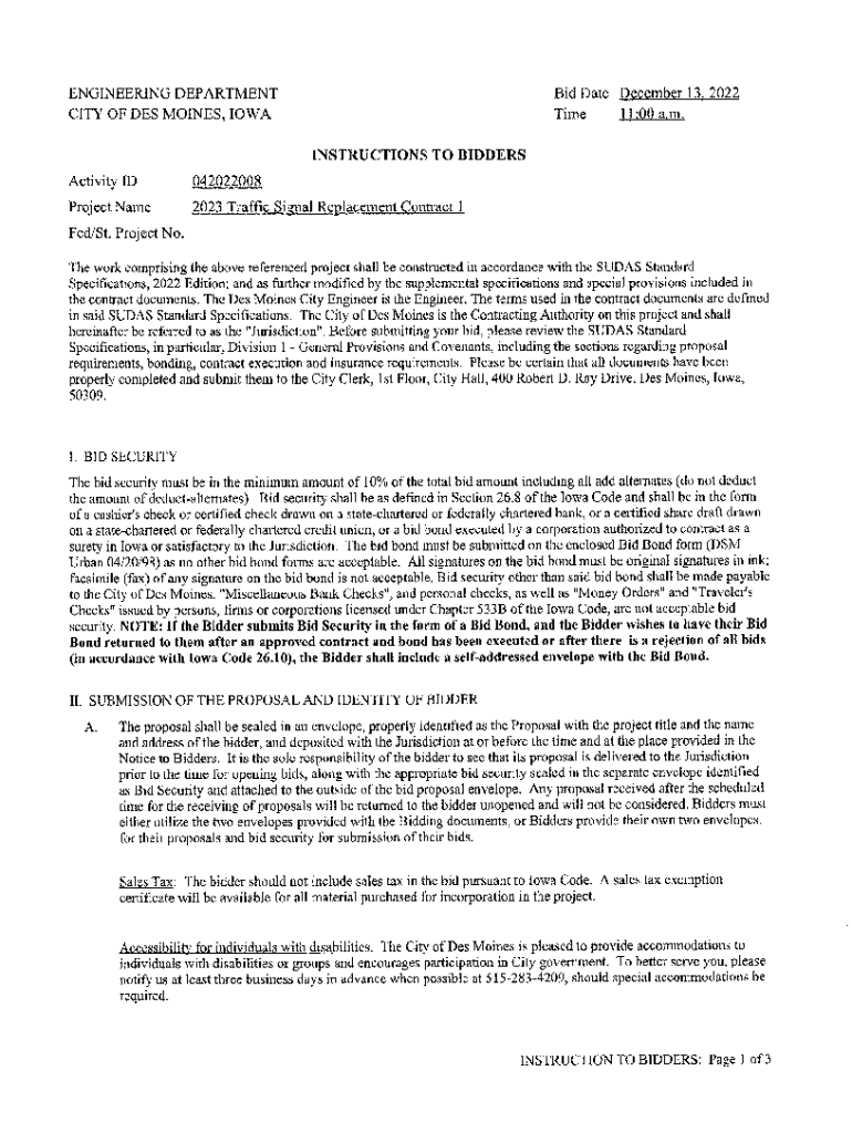Bid Date December 13, 2022 11:00 a.m.ENGINEERING DEPARTMENT CITY OF DES MOINES, Downtime INSTRUCTIONS TO BIDDERSActivity ID042022008Project Name2023 Traffic Signal Replacement Contract 1Fed/St. Project