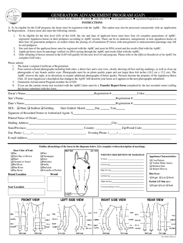 GENERATION ADVANCEMENT PROGRAM (GAP) 2720 W. Pullman Road. Moscow, ID 83843 (208) 8825578 www.appaloosa.com registration@appaloosa.comINSTRUCTIONS A. To be eligible for the GAP program, the horse