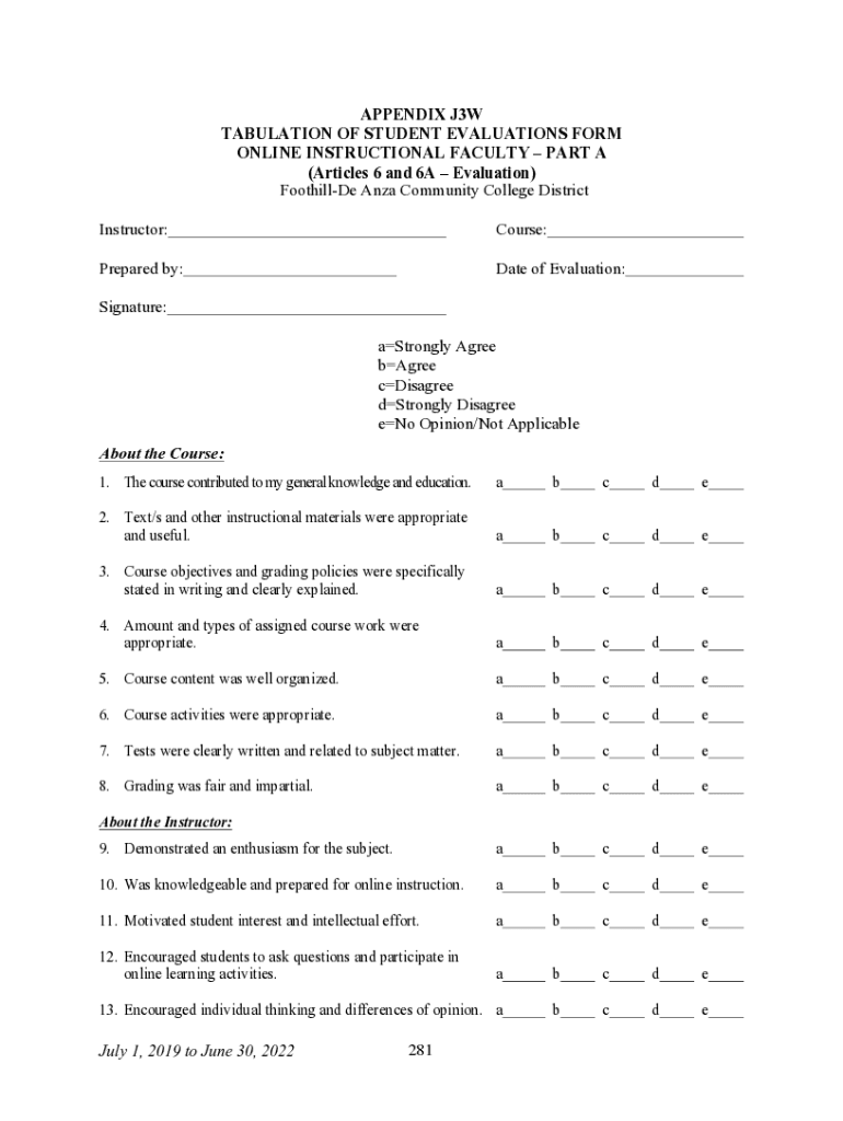 APPENDIX J3W TABULATION OF STUDENT EVALUATIONS FORM ONLINE INSTRUCTIONAL FACULTY PART A (Articles 6 and 6A Evaluation) Foothills Anna Community College District Instructor:Course:Prepared by:Date