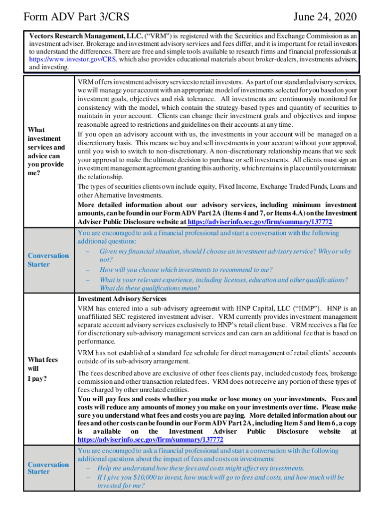 Form ADV Part 3/CRS June 24, 2020Vectors Research Management, LLC. (ARM) is registered with the Securities and Exchange Commission as an investment adviser. Brokerage and investment advisory services