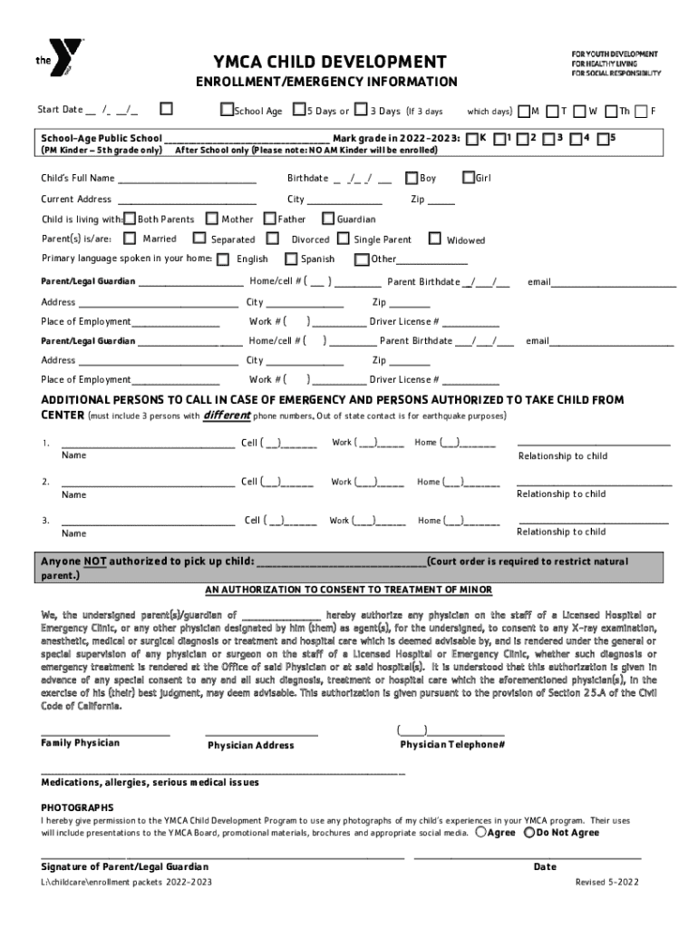 YMCA CHILD DEVELOPMENT ENROLLMENT/EMERGENCY INFORMATION Start Date ___/___/___Preschool5 Days school Age3 Days (If 3 days mark which days)Schoolmate Public School ___ Mark grade in 20222023: (PM Kinder