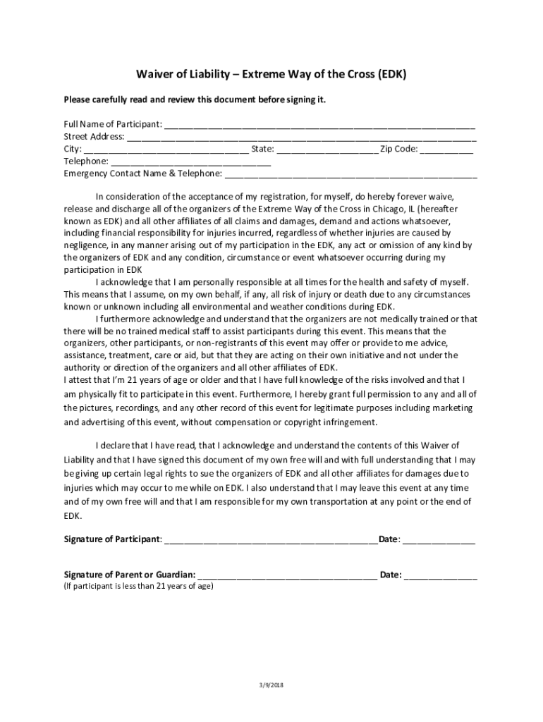 Waiver of Liability Extreme Way of the Cross (EDS) Please carefully read and review this document before signing it. Full Name of Participant: ___ Street Address: ___ City: ___ State: ___ Zip Code: