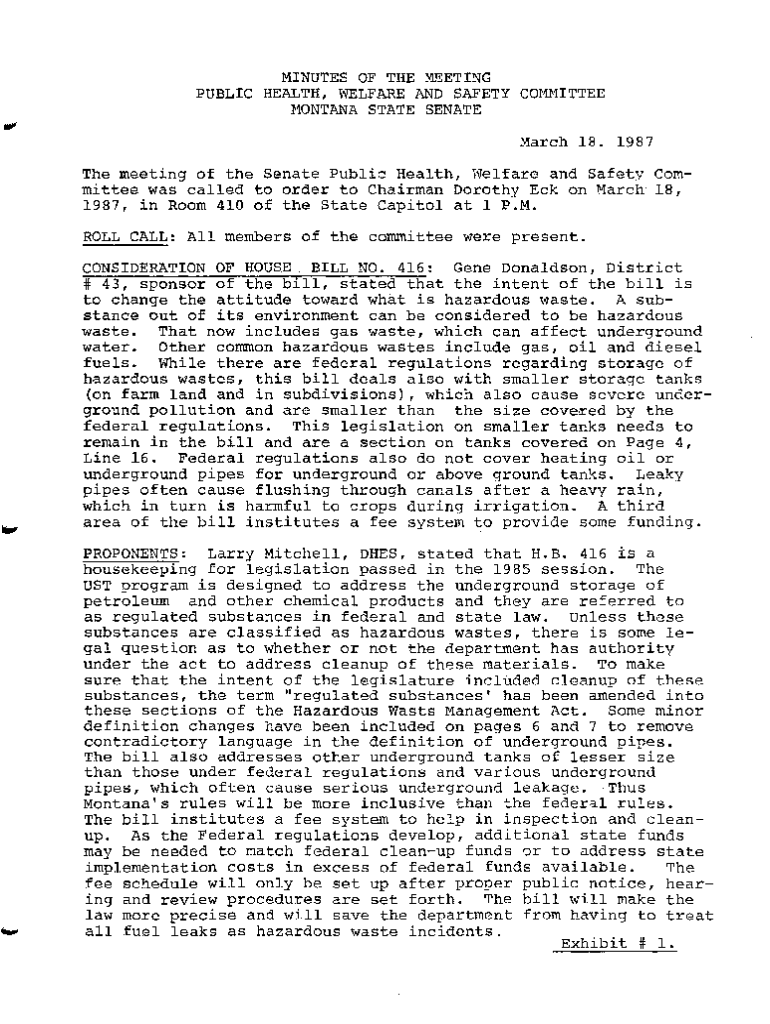 MINUTES OF THE MEETING PUBLIC HEALTH, WELFARE AND SAFETY COMMITTEE MONTANA STATE SENATE March 18. 1987 The meeting of the Senate Public Health, Welfare and Safety Committee was called to order to