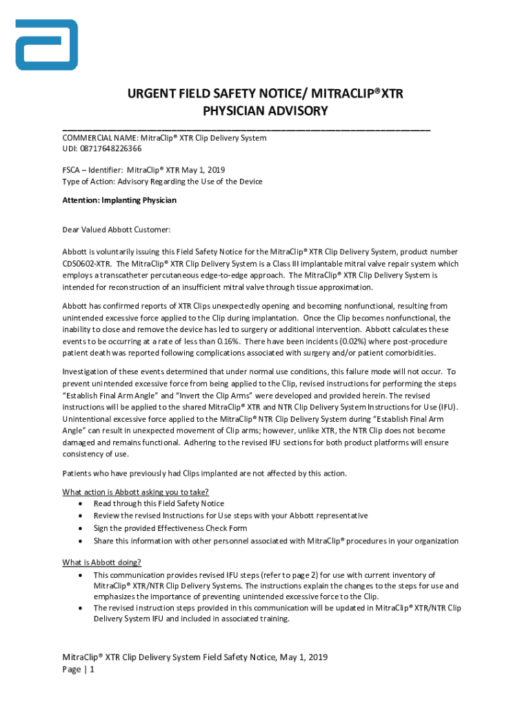 AbbottisvoluntarilyissuingthisFieldSafetyNoticefortheMitraClipXTRClipDeliverySystem,