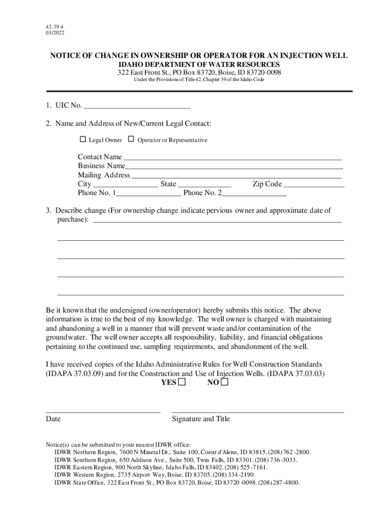 42394 03/2022NOTICE OF CHANGE IN OWNERSHIP OR OPERATOR FOR AN INJECTION WELL IDAHO DEPARTMENT OF WATER RESOURCES 322 East Front St., PO Box 83720, Boise, ID 837200098 Under the Provisions of Title