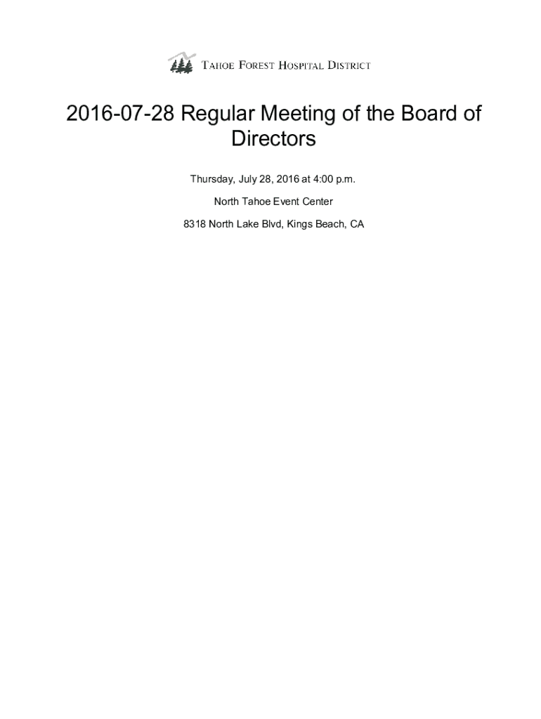 20160728 Regular Meeting of the Board of Directors Thursday, July 28, 2016, at 4:00 p.m. North Tahoe Event Center 8318 North Lake Blvd, Kings Beach, Meeting Book 20160728 Regular Meeting of the Board