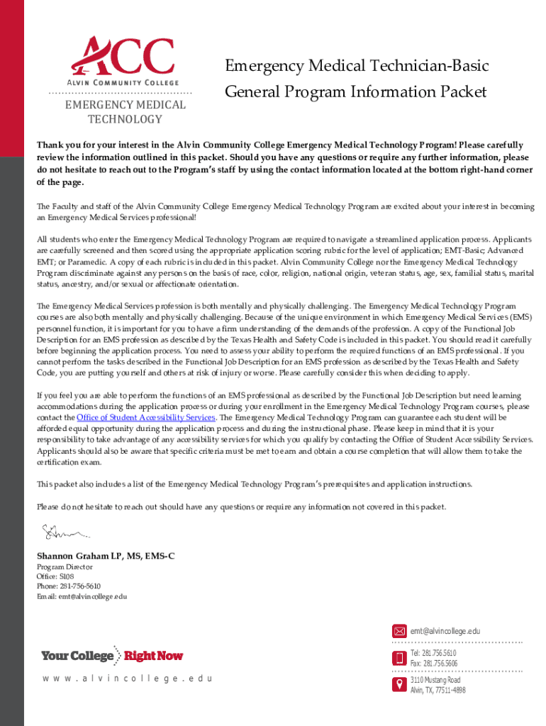 Emergency Medical TechnicianBasic EMERGENCY MEDICAL TECHNOLOGYGeneral Program Information PacketThank you for your interest in the Alvin Community College Emergency Medical Technology Program! Please